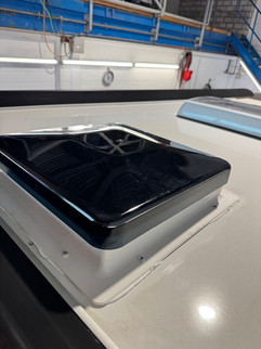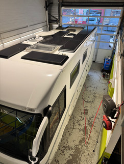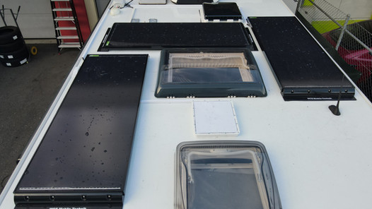 Auf dem Dach wurde die verfügbare Fläche konsequent genutzt. Mehrere hochwertige Solarpanels sorgen dafür, dass der Camper auch bei längeren Standzeiten autark bleibt. Die Anordnung ist so gewählt, dass Dachhauben, Lüfter und Aufbauten weiterhin problemlos funktionieren – keine Bastellösung, sondern sauber geplant.